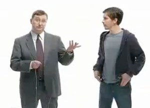 ‘Restarting’ (@2:05) addresses the issue of crashes. Macs are by no means completely immune to them, but the frequency is so seldom that its not considered a problem. PC users, on the other hand, are well aware of this inconvenience, particularly at the time of these spots. PC tries to deliver a statement in the beginning of this commercial, but gets stuck and has to restart. The awkward repeating of his first statement reminds the audience of the senseless need to restart their own computers. Mac tries to tell PC he they already passed that point in the commercial, and PC explains he had to restart, adding “You know how it is.” To which Mac replies that he doesn’t have that problem. In case Mac’s reply wasn’t enough of an appeal to the audience, just as things get going, PC gets stuck again…and Mac goes to get help from IT.