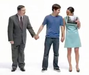 Another example of Mac’s simplicity is shown in ‘Network’ (@0:32) The spot begins with PC and Mac holding hands. PC proudly explains that he can easily network with Macs. When a Japanese woman—representing a digital camera—joins Mac’s network, PC appears left out because he can’t speak her language. The message that Mac is easier than PC comes across clearly, “Everything just kind of works with Mac.” The spot ends with another awkward PC moment as he attempts to speak to the Japanese woman in French.