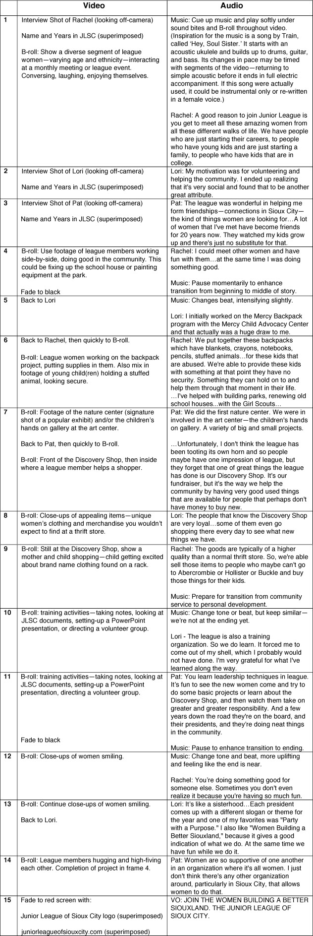 This post is a final submission of work for the IMC 634 course. It includes the full concept paper and paper edit for my project—an interview-driven recruitment video for the Junior League of Sioux City (JLSC). It is quite similar to the post from last week, but has been edited and hopefully improved. Again, the paper edit provides direction for final editing of interview clips and B-roll footage as well as use of music to accompany the film. The end result should be a piece that is between three and four minutes in length with sufficient room for pauses and transitions.